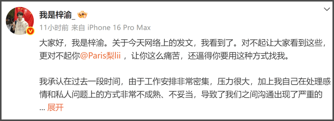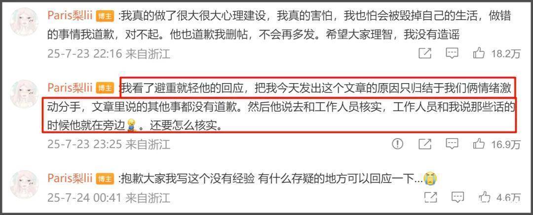 天然梓渝在前女友爆料文发出后不久就立马发长文恢复,承认空虚,然则对劈叉一事已然不提,只说是我方不老练,莫得解决好私情面感问题,临了上前女友和粉丝说念歉,并暗意要暂停一段时刻的公开责任,崇敬反念念。