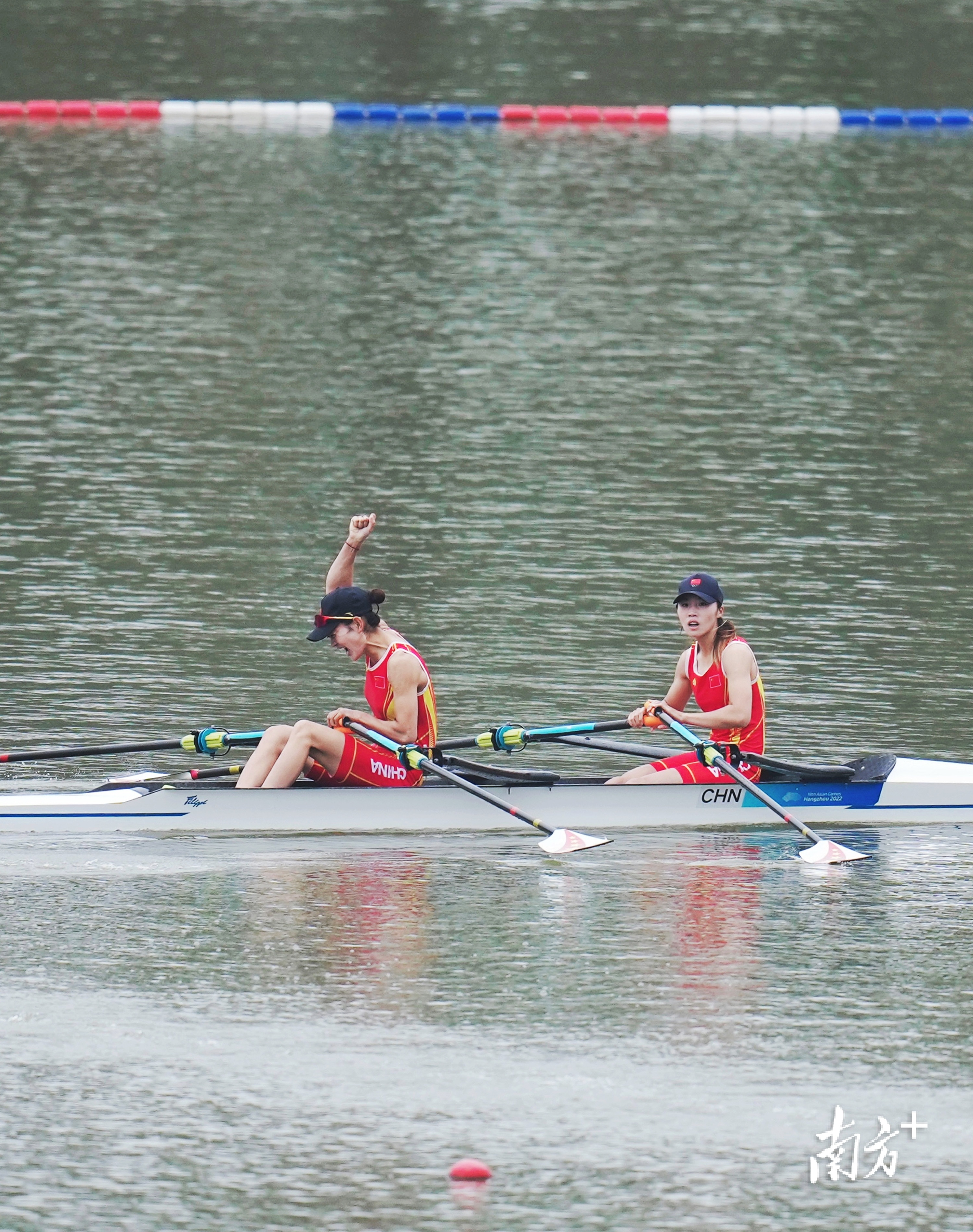 9月24日上昼,广东选手邱秀萍(左)与搭档邹佳琪夺得赛艇女子轻量级双东说念主双桨冠军,为中国代表团赢得本届亚运会首枚金牌。