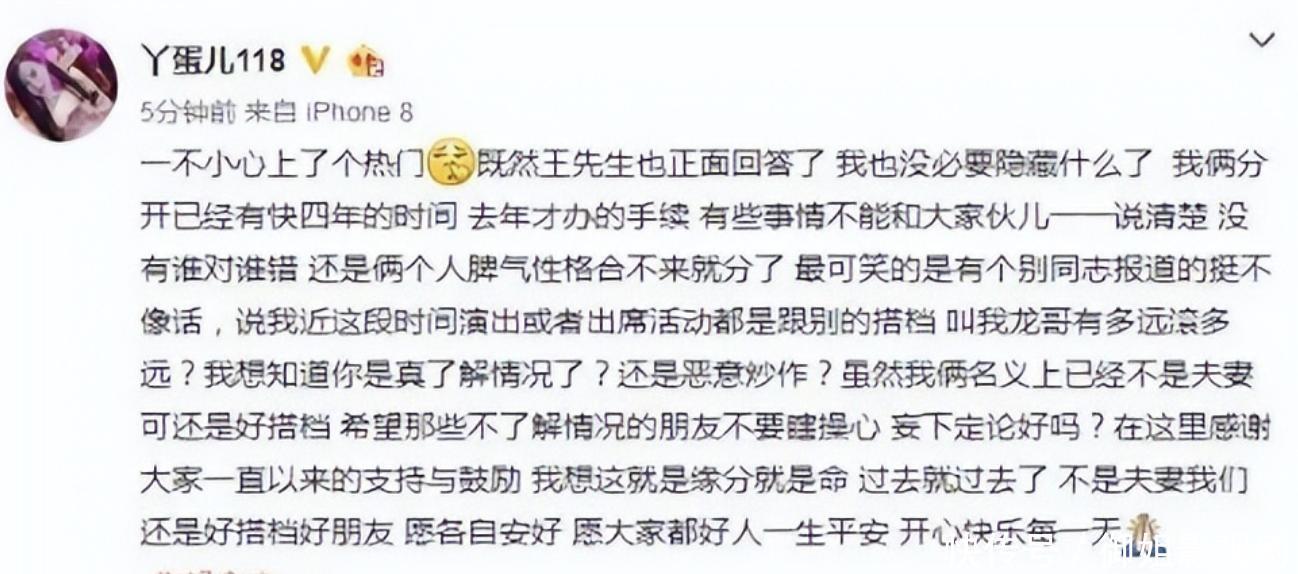 在2017年,王金龙在直播的时期正面回复了这个问题,承认两东谈主照旧离异,随后丫蛋在酬酢平台上打发了离异的全部进程。