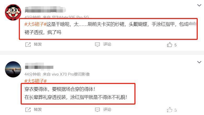 ——红指甲、黑头巾、白蝴蝶,大S零丁葬礼造型过于吸睛了,更别提隐模糊约可可见内搭的透视纱裙,更是遭到网友质疑,念念说在葬礼上如斯穿搭,是不是有些太出格?